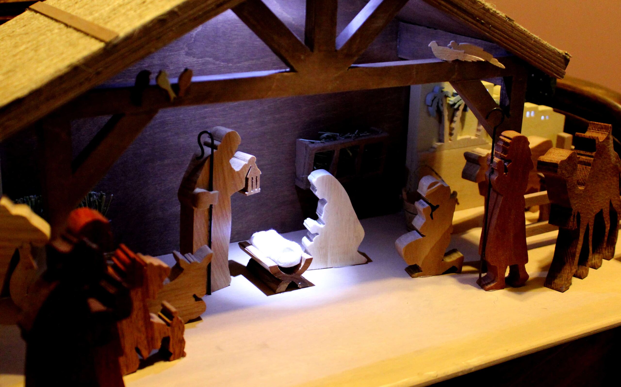 The Nativity is a great holiday project. Unique among the thousands of Nativity scenes around the world. Nearly all wood. The color in photos is not paint but rather from over 20 different hardwoods. The stable and accessories are mostly from Baltic birch. Trees, distant city and other accessories can be painted. Color information is included. The roof is fashioned from strands of jute. Use grass hay or straw in the wall manger and wrapped bundles. The starry sky over distant Bethlehem is from printouts included with the plan. Patterns are full size with detailed cutting and assembly instructions. But the real surprise comes when room lights are lowered and the star raised up from behind the set the nativity lighting turned on. The option includes four beam type LEDs that light the Star of the East, the manger and over a dozen windows in the distant city. Instructions included for using a standard LED flashlight, a little wire, a switch and basic soldering to add the lighting effects. Three AA batteries will light the scene for over three weeks. Just the thing for the holiday table, book case or mantle. 28″ long , 10″ deep x 11″ high. For a novice to intermediate woodworker depending on options added to the project. Our 11″ x 17″ plans take little workbench space. The copyrights allow making a photocopy of the full size patterns. Trim out the patterns, apply spray adhesive on the backs and place on stock prepared to the thickness noted on the pattern. You get accurate parts and no tracing. We mail fast, usually within one business day.