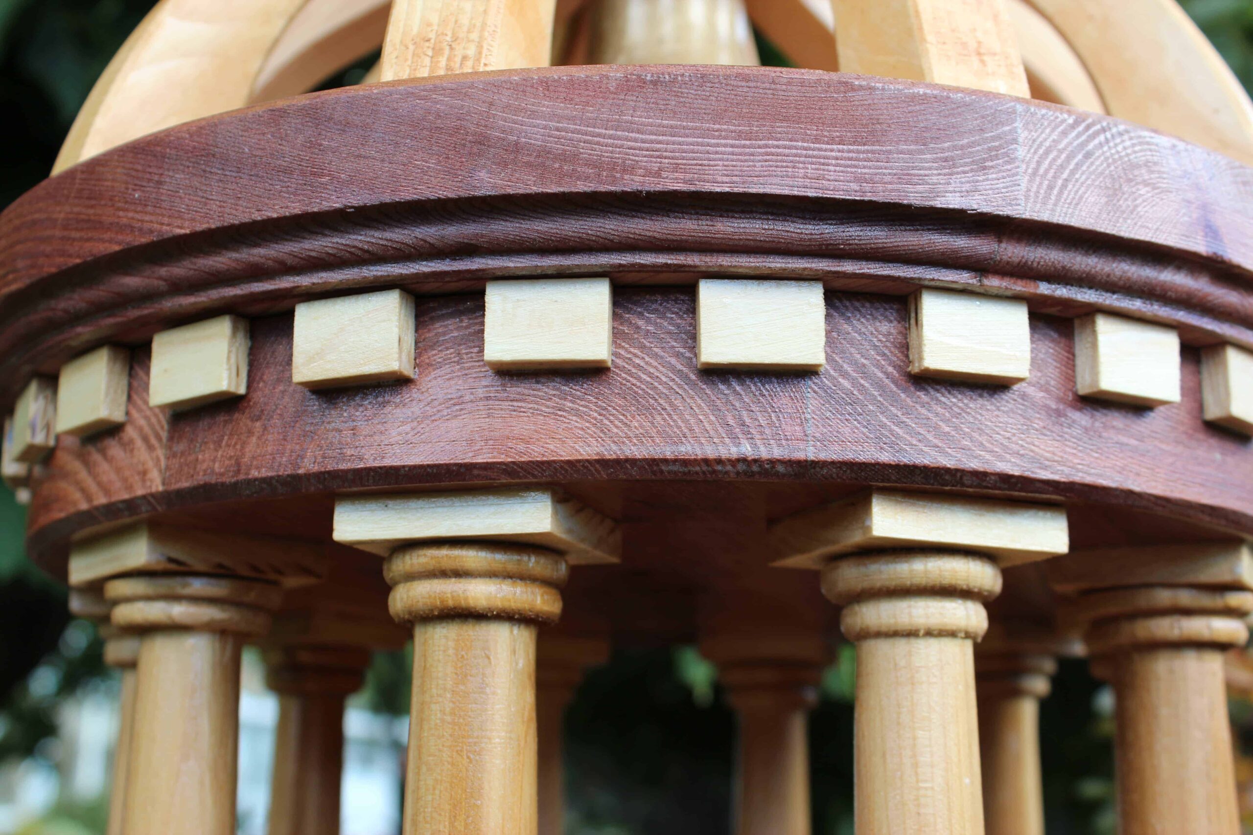 A classy bird feeder woodworking plan for the yard or garden.  Inspired by Roman dome and column architecture.  Construct the Tuscany Bird Feeder from common fence or patio stock.  Redwood and Cedar are shown.  Mount atop a 4″ x 4″ fence post to invite birds for a meal.  Options include substituting turned columns with dowels and using a purchased finial if a lathe is not available.  The columns can be replaced with walls to build as a birdhouse.  Place seed at two levels for visiting birds.  From the bottom of the brackets to the top of the finial is 38″.   For an intermediate woodworker. Our 11″ x 17″ plans take little workbench space.  The copyrights allow making a photocopy of the full size patterns.  Trim out the patterns, apply spray adhesive on the backs and place on stock prepared to the thickness noted on the pattern.  You get accurate parts and no tracing.  We mail fast, usually within one business day.